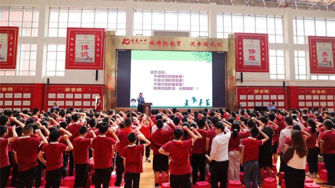 在南充市第十中学,雷蕾带领孩子们一起宣誓,拒绝校园欺凌。