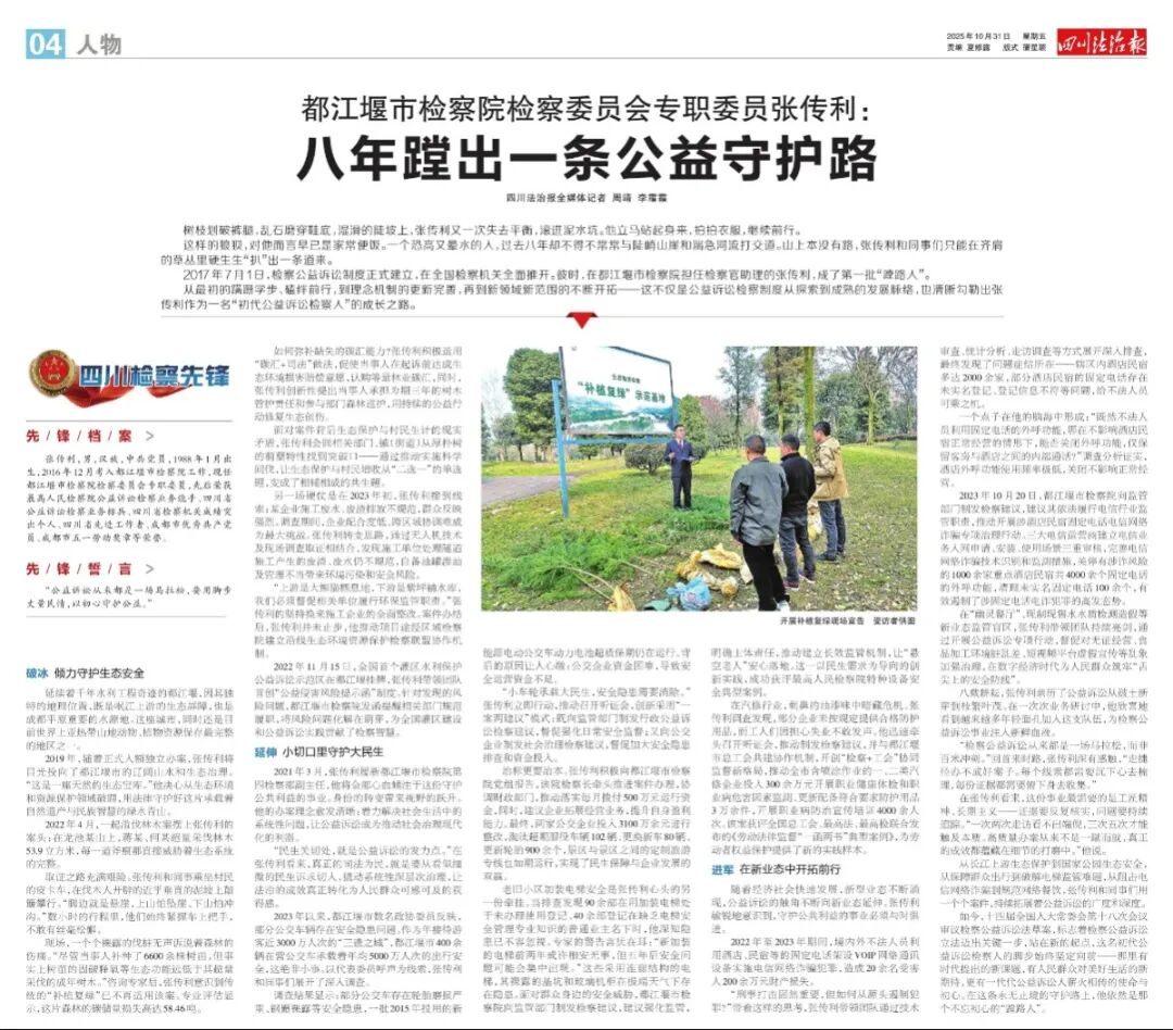 2019年,随着正式入额独立办案,张传利将目光投向了都江堰市的辽阔山水和生态治理。“这是一座天然的生态宝库。”张传利说。他决心从生态环境和资源保护领域破题,用法律守护好这片承载着自然遗产与民族智慧的绿水青山。