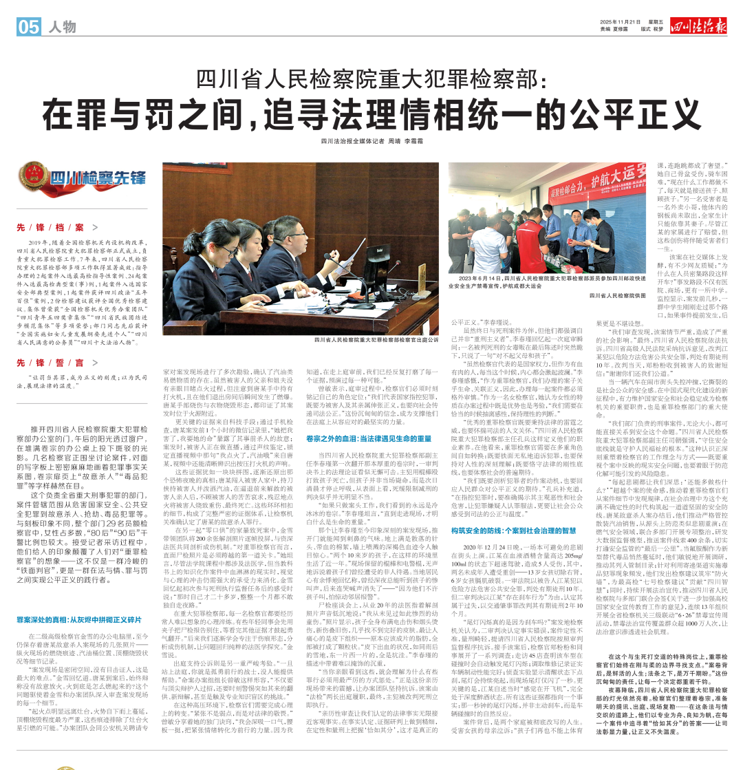 夜幕降临,四川省人民检察院重大犯罪检察部的灯光依然亮着。检察官们整理着卷宗,准备明天的提讯、出庭、现场复勘……在这条法与情交织的道路上,他们以专业为舟、良知为帆,在每一个案件中追寻着“恰如其分”的答案——让司法彰显力量,让正义不失温度。