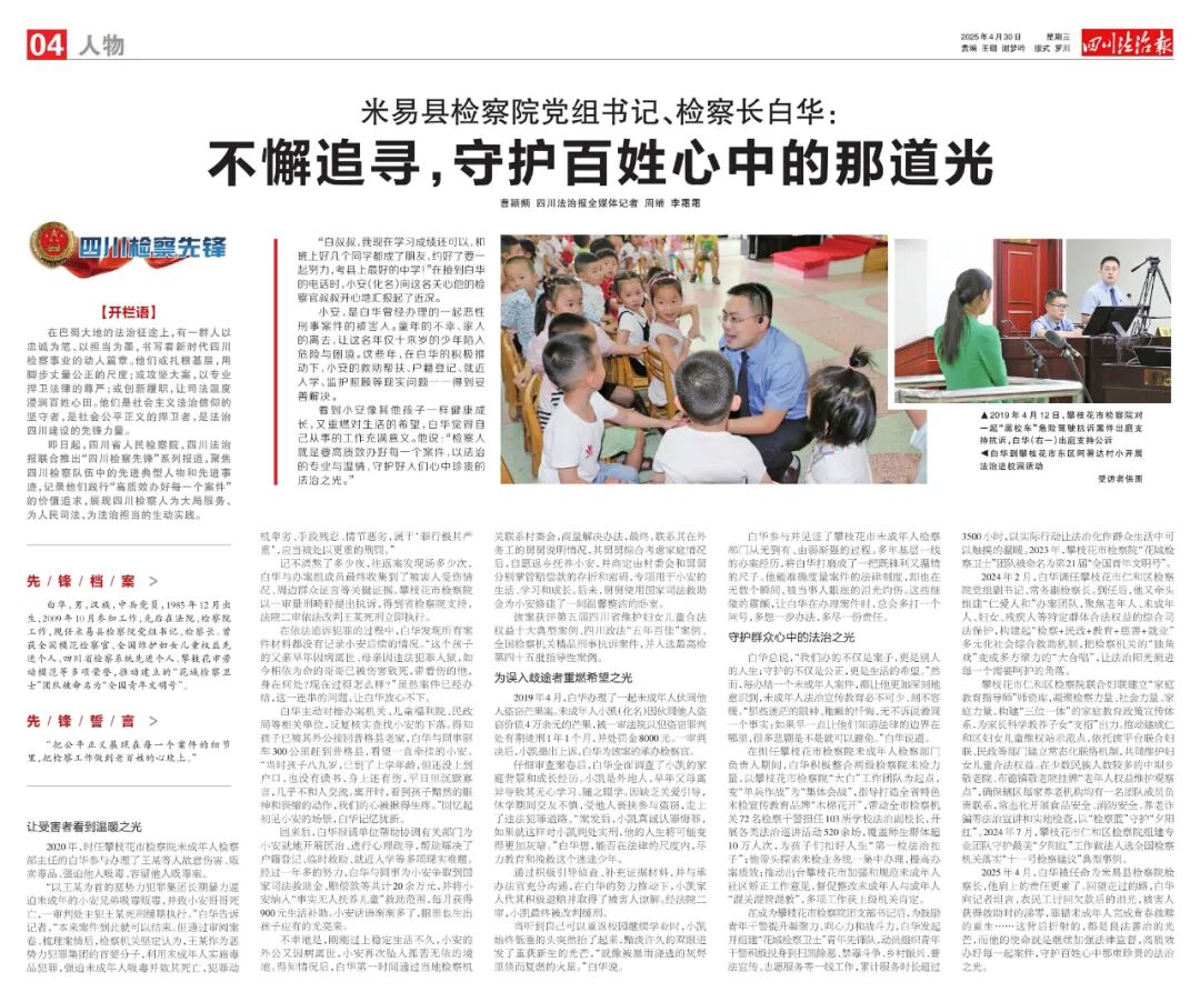 2024年2月,白华调任攀枝花市仁和区检察院党组副书记、常务副检察长。到任后,他又牵头组建“仁爱人和”办案团队,聚焦老年人、未成年人、妇女、残疾人等特定群体合法权益的综合司法保护,构建起“检察+民政+教育+慈善+就业”的多元化社会综合救助机制,把检察机关的“独角戏”变成多方聚力的“大合唱”,让法治阳光照进每一个需要呵护的角落。