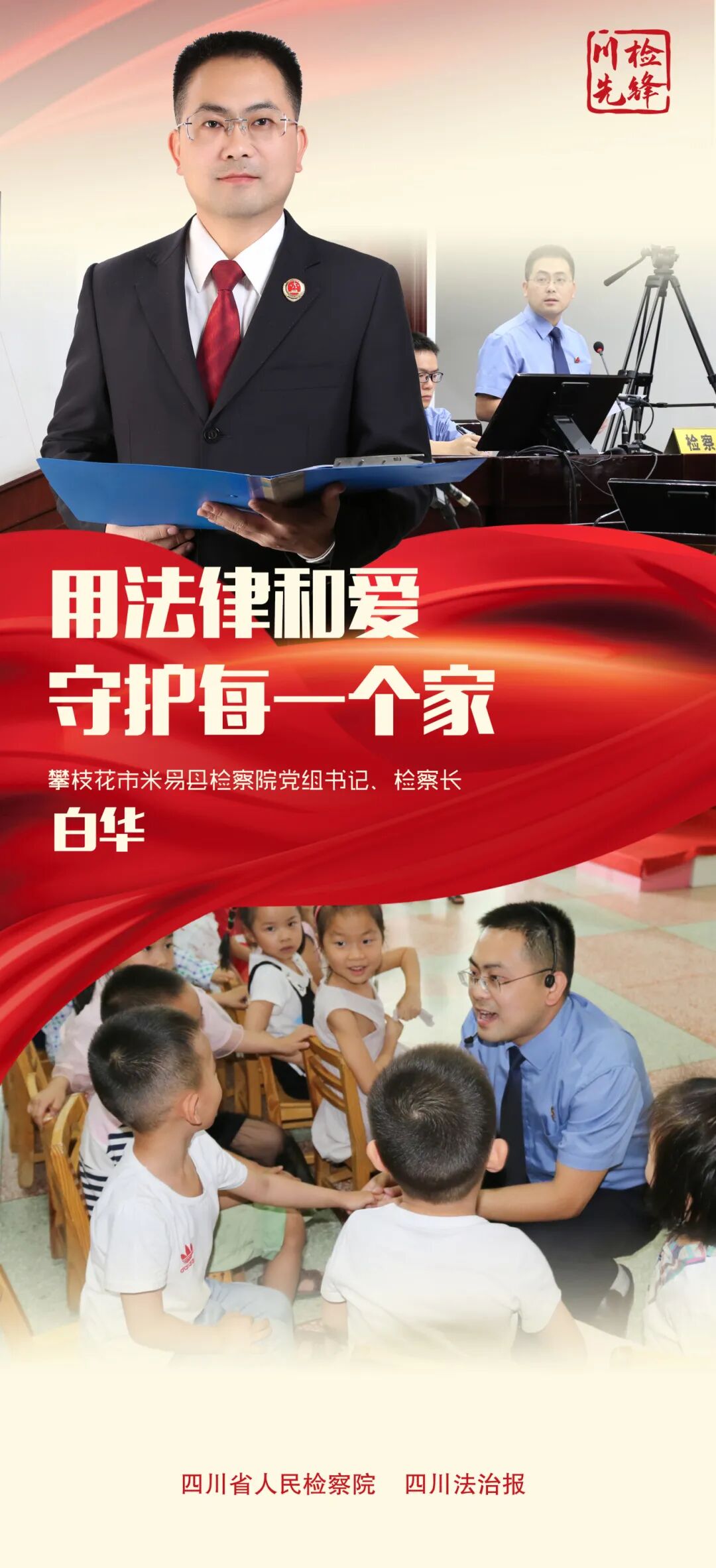 在担任攀枝花市检察院未成年人检察部门负责人期间,白华积极整合两级检察院未检力量,以市检察院“大白”工作团队为起点,变“单兵作战”为“集体会战”,指导打造全省特色未检宣传教育品牌“木棉花开”,带动全市检察机关72名检察干警担任103所学校法治副校长,开展各类法治巡讲活动520余场,覆盖师生群体超10万人次,为孩子们扣好人生“第一粒法治扣子”;他带头探索未检业务统一集中办理,提高办案质效;推动出台攀枝花市加强和规范未成年人社区矫正工作意见,督促整改未成年人与成年人“混关混管混教”,多项工作获上级机关肯定。