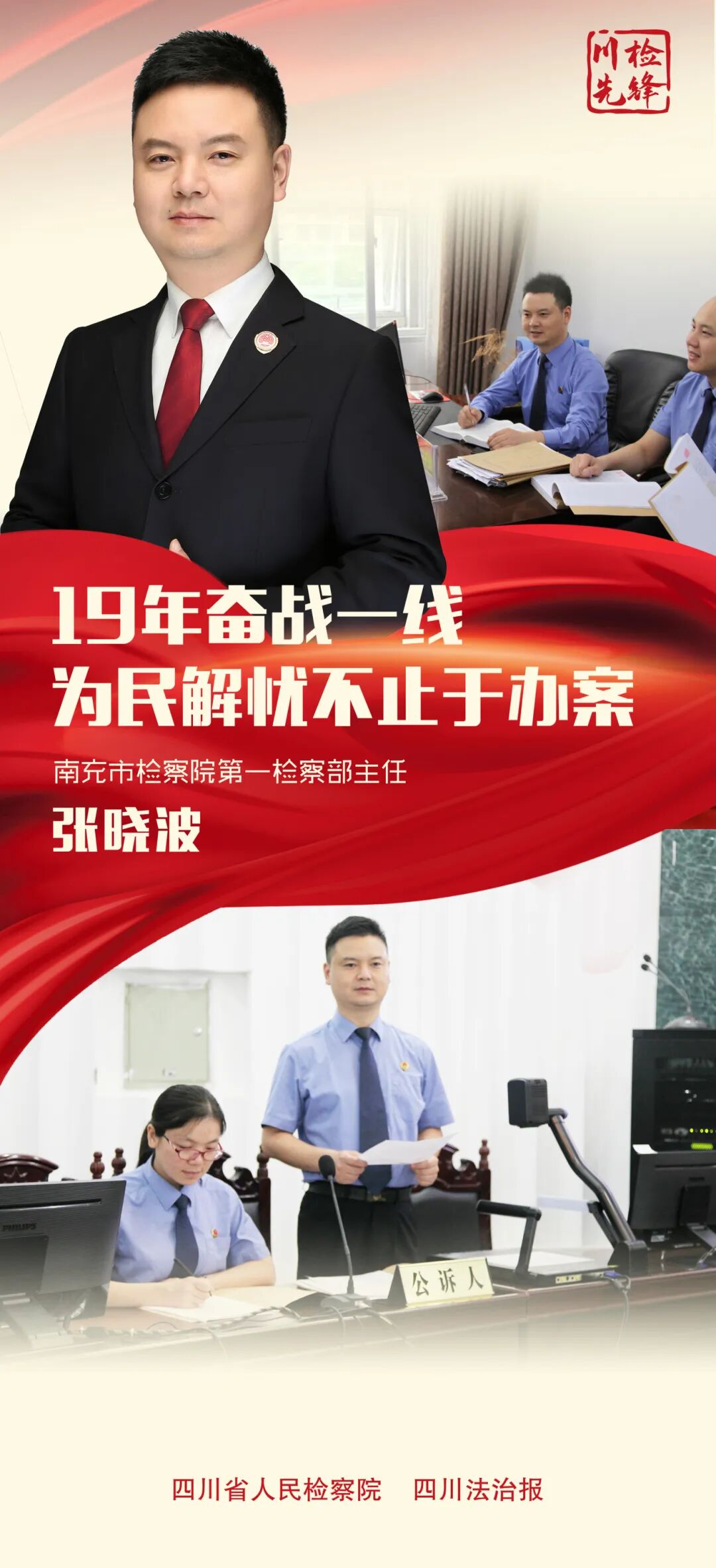 张晓波,男,汉族,中共党员,1982年9月出生,2006年进入西充县检察院工作,现任南充市检察院第一检察部主任。先后获得平安四川建设先进个人、四川政法先锋等20余项荣誉,2019年被中共四川省委、省人民政府记一等功,2023年被人社部、最高检授予“全国模范检察官”称号,2025年4月荣获“全国先进工作者”称号。