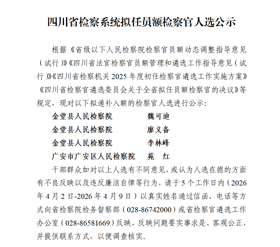 四川省检察系统拟任员额检察官人选公示