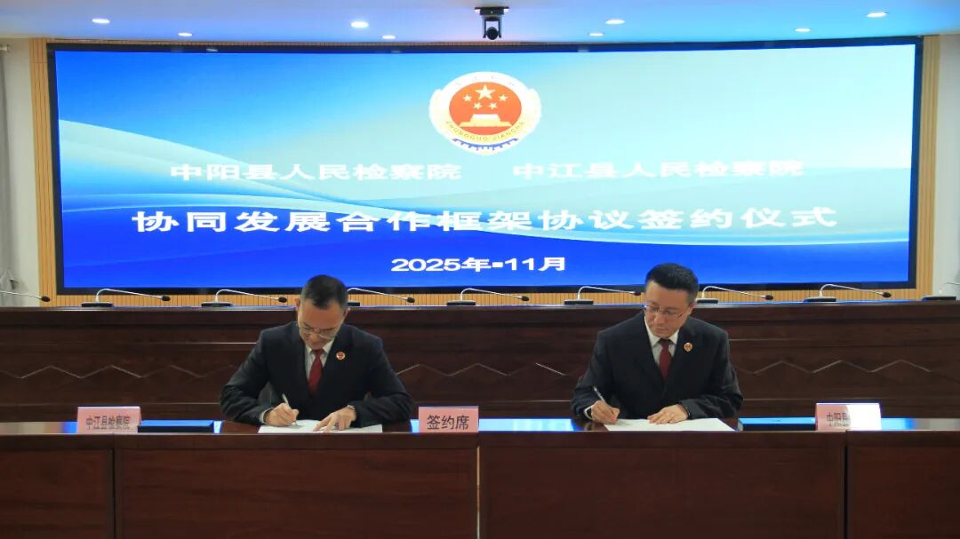 11 月 19 日,四川省中江县检察院与山西省中阳县检察院正式签署《协同发展合作框架协议》,标志着两院跨区域检察合作进入实质推进阶段。此次合作是两院深入落实“三个管理”要求、构建检察“大管理”格局的具体实践。签约仪式上,双方围绕服务县域发展、提升法律监督质效等展开深入交流,分享经验做法。两院相关业务部门围绕刑事、民事行政、公益诉讼检察等工作进行专题研讨,通过案例复盘、经验交流凝聚共识、互学互鉴。双方表示,将以此次合作为新起点,持续健全常态化协作机制,深化业务交流与经验互鉴,努力将合作成效转化为服务两地经济社会发展的检察实绩,共同谱写基层检察工作高质量发展新篇章。
