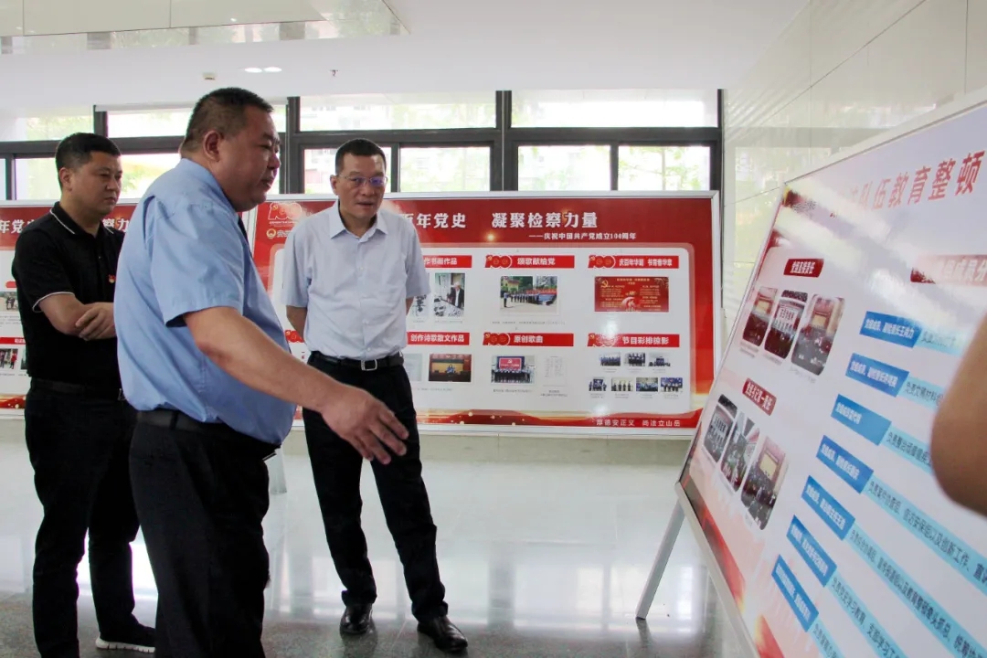 冯键检察长通过查看展板资料、现场听取汇报等方式详细全面了解资阳市两级检察院开展党史学习教育和政法队伍教育整顿的相关情况,针对重点工作现场询问,充分了解两级检察院党史学习教育中指定书目学习情况,政法队伍教育整顿中查找出的突出问题、干警对领导班子提出的意见建议等。
