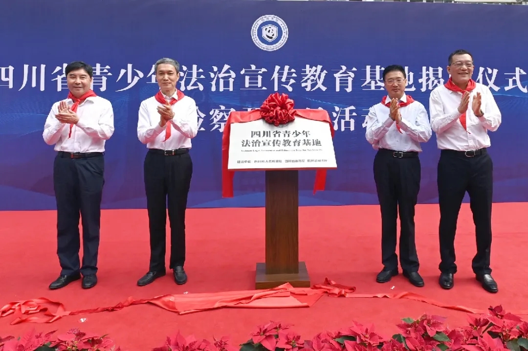 童建明、叶壮、冯键、刘志诚共同为四川省青少年法治宣传教育基地揭牌。
