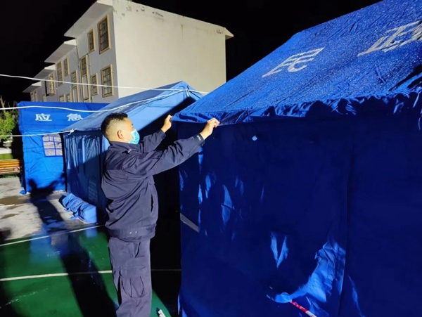 2022年9月7日晚,甘孜州泸定县人民检察院检察干警积极参与震区救援工作,为灾区人民搭建帐篷。