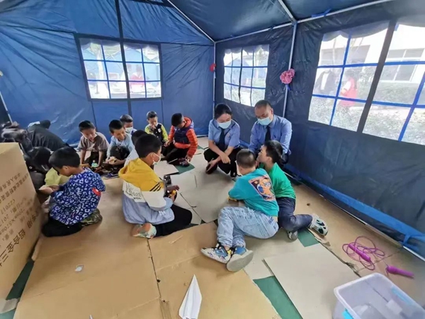 图为:甘孜绿芽·泸定蓓蕾未检团队检察官在地震受灾儿童安置点给孩子们做心理疏导。
