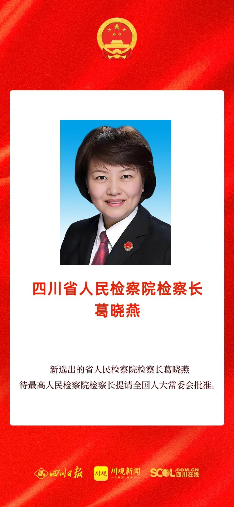 1月15日下午举行的四川省第十四届人民代表大会第一次会议第三次全体会议,选举葛晓燕为省人民检察院检察长,新选出的省人民检察院检察长葛晓燕,待最高人民检察院检察长提请全国人大常委会批准。
