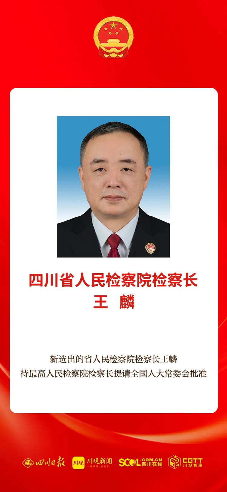 1月26日上午举行的四川省第十四届人民代表大会第二次会议第三次全体会议,选举王麟为四川省人民检察院检察长,待最高人民检察院检察长提请全国人大常委会批准。